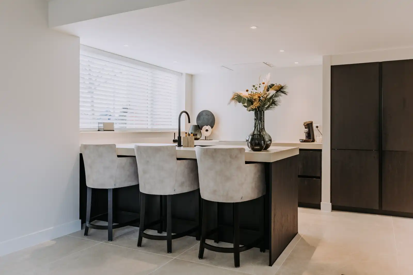 De bewoners waren op zoek naar een rustige, chique sfeer met een luxe uitstraling. Die wens is vertaald naar een kleurenpalet van zand, crème, zwart en goud. Rijke materialen en subtiele details brengen de gewenste sfeer écht tot leven.