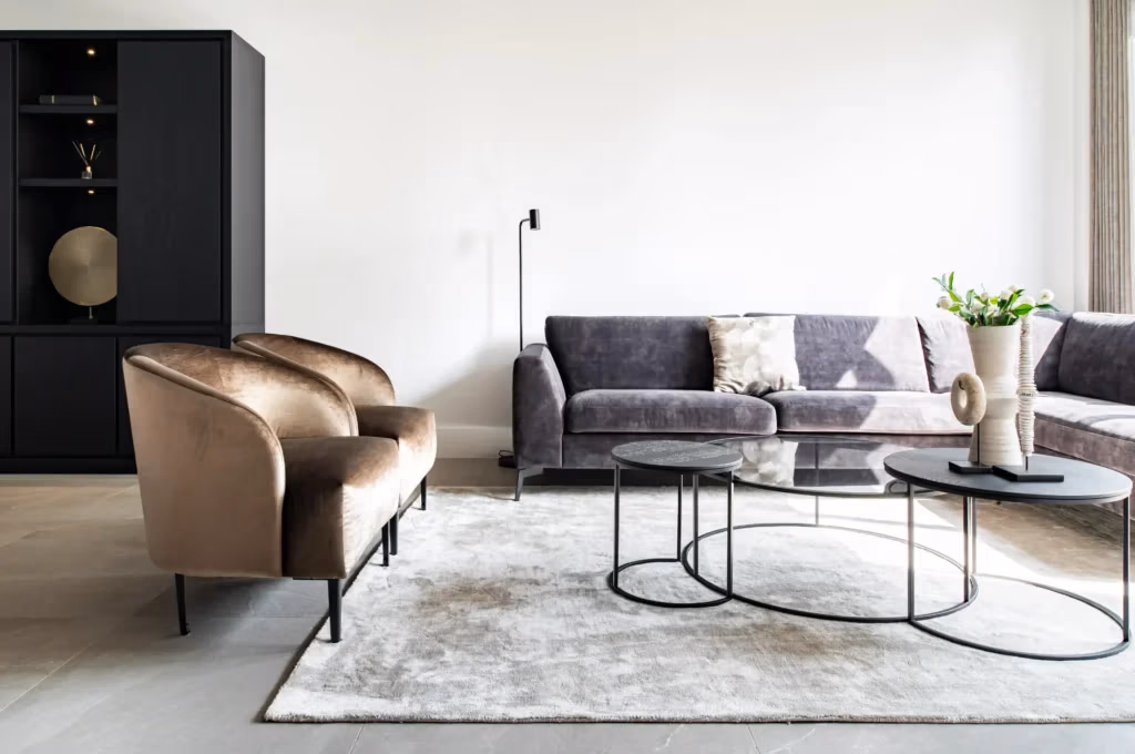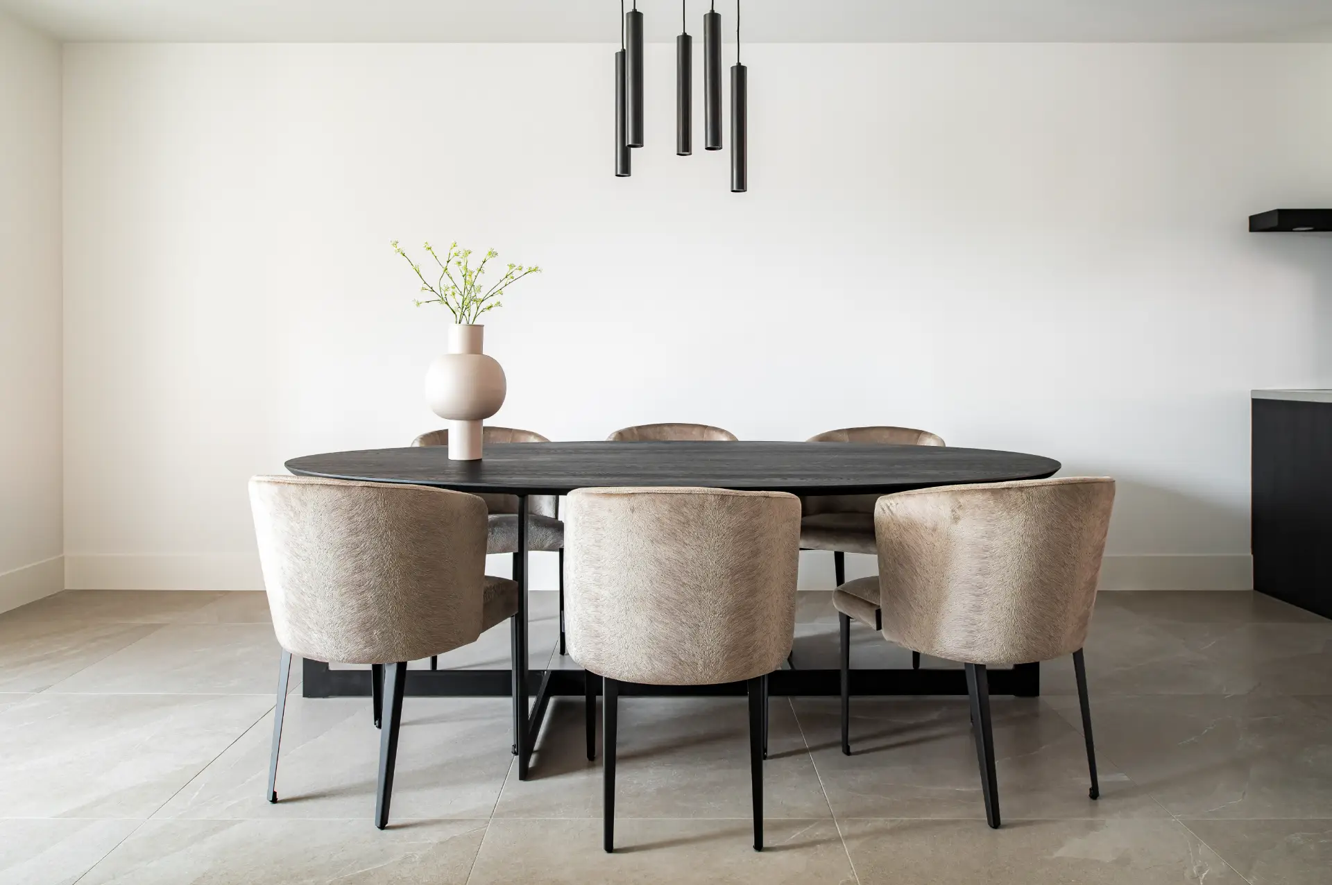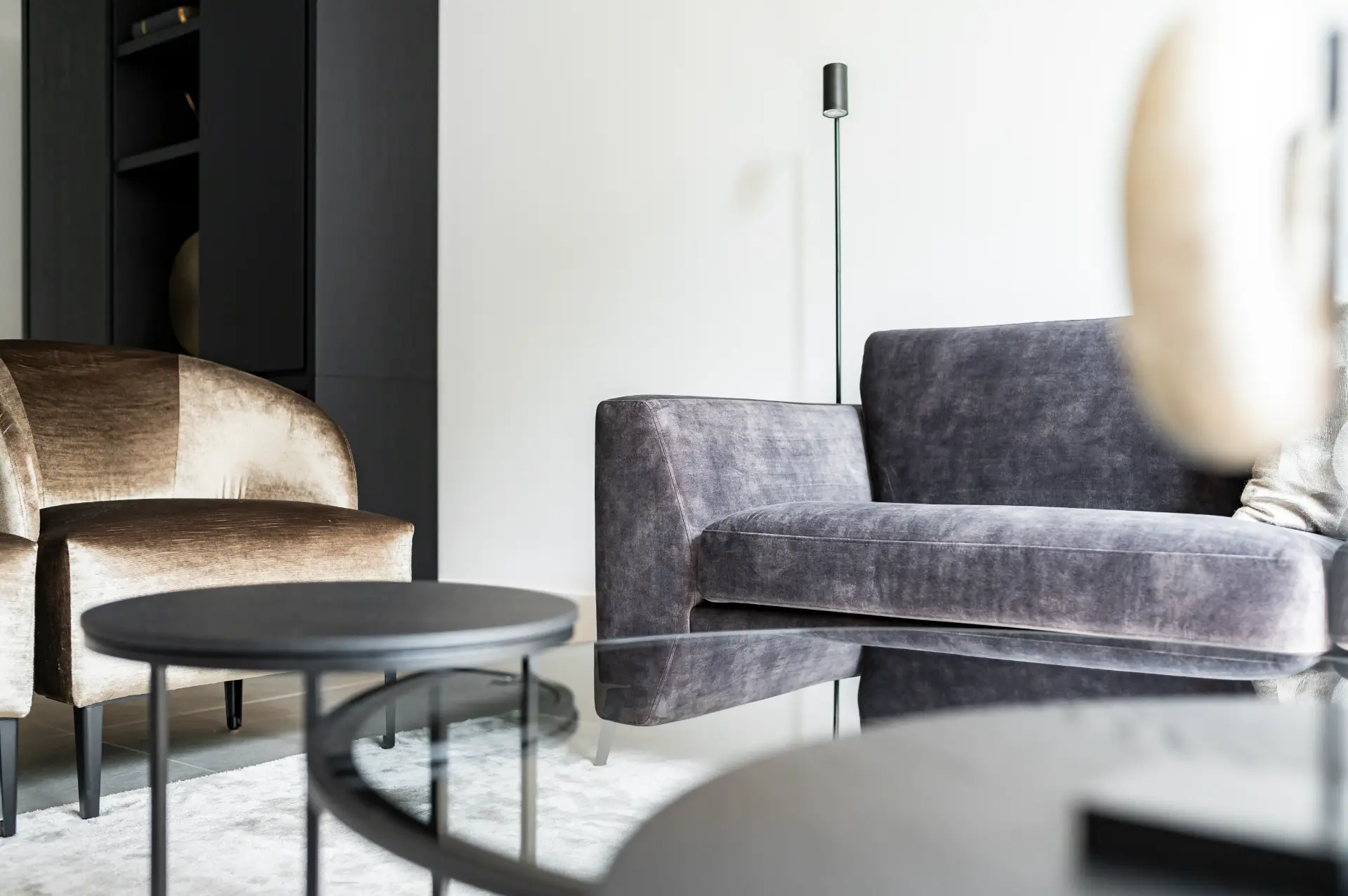 De wens voor een luxueuze en chique sfeer met een warme uitstraling vormde het uitgangspunt van dit project. Die vertaalslag begon met het kiezen van ronde vormen in banken, fauteuils en accessoires. In combinatie met materialen zoals velvet in zachte, glanzende kleuren ontstond de inrichting die de bewoners voor ogen hadden.