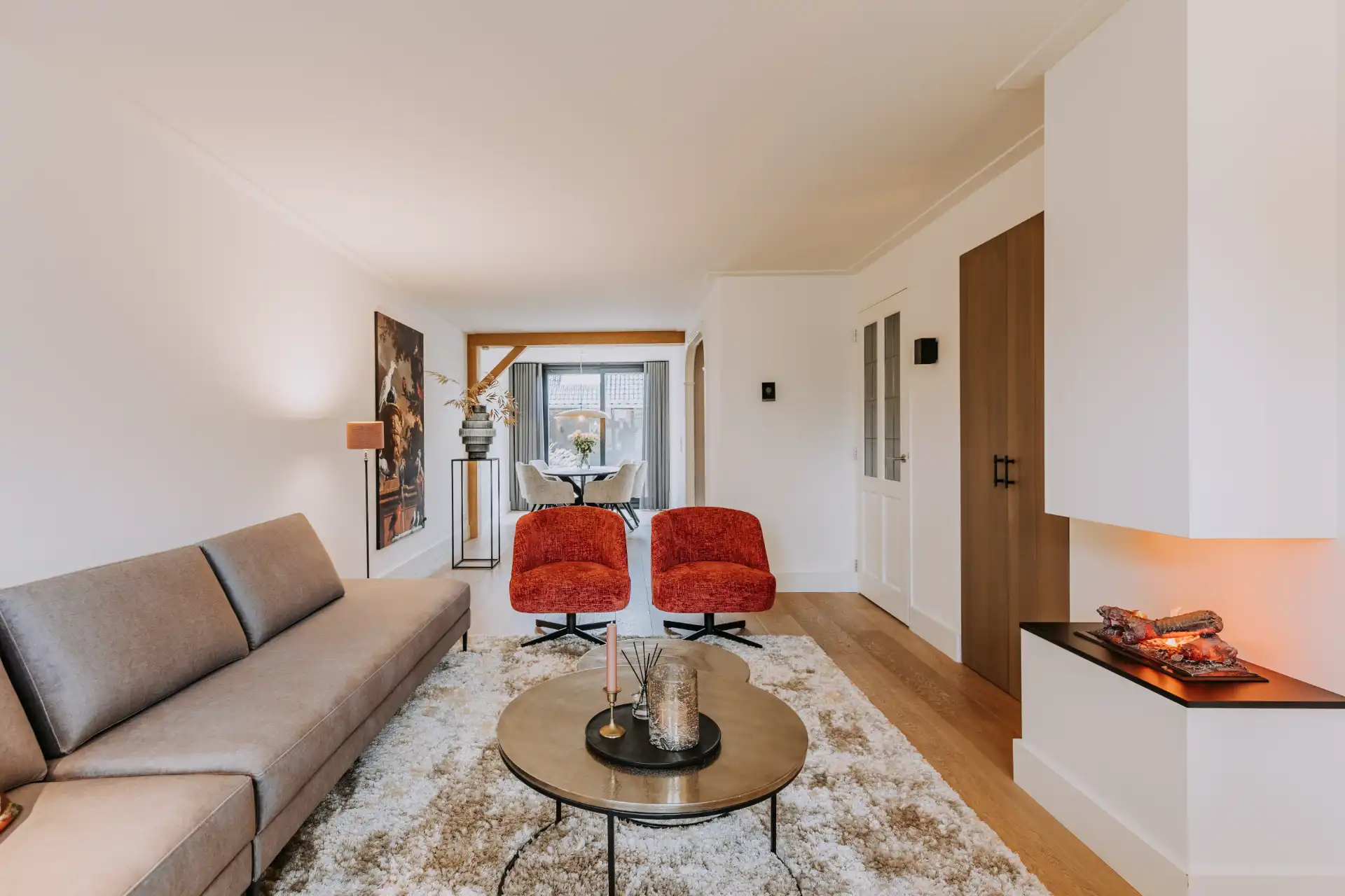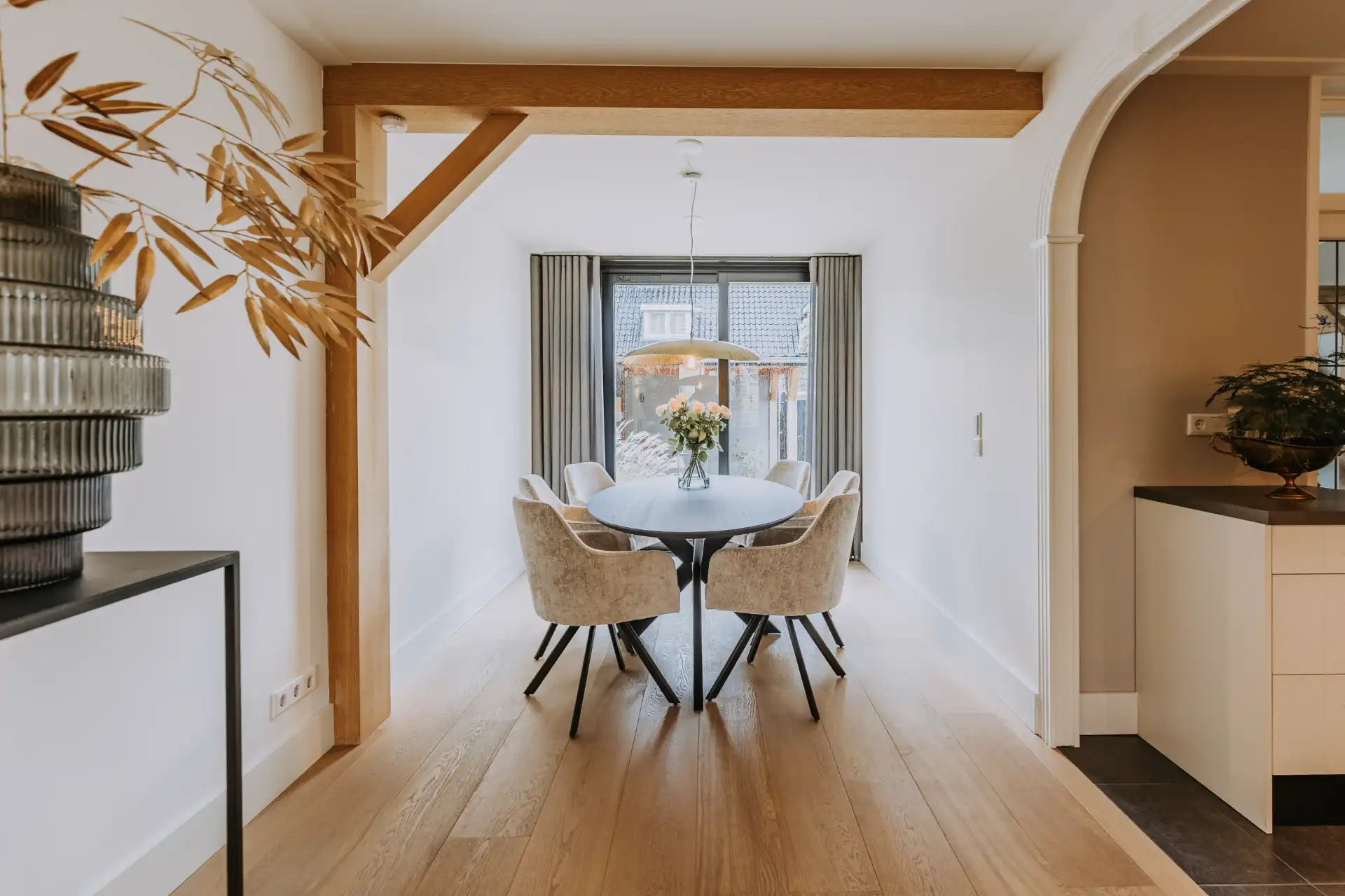 De zitmeubelen, eetkamertafel met stoelen, verlichting, raambekleding en accessoires vormen samen één geheel. Iedere ruimte is op elkaar afgestemd, met zorgvuldig gekozen kleuren en materialen die perfect passen bij de architectuur én de wens van de bewoners.