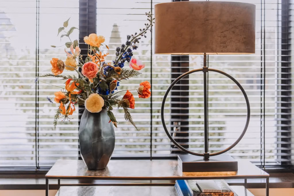 In dit interieur draait het om lef en balans. Donkere, uitgesproken kleuren zijn gecombineerd met warme houttinten en verfijnde goudaccenten, wat zorgt voor een krachtige maar stijlvolle uitstraling. De strakke lijnen van de architectuur worden verzacht door het gebruik van rijke stoffen en sfeervolle verlichting. De raambekleding speelt daarin een belangrijke rol. Inbetweens met waveplooi op een railroede zorgen voor een zachte lichtinval en de horizontale jaloezieën geven controle over sfeer en privacy.
