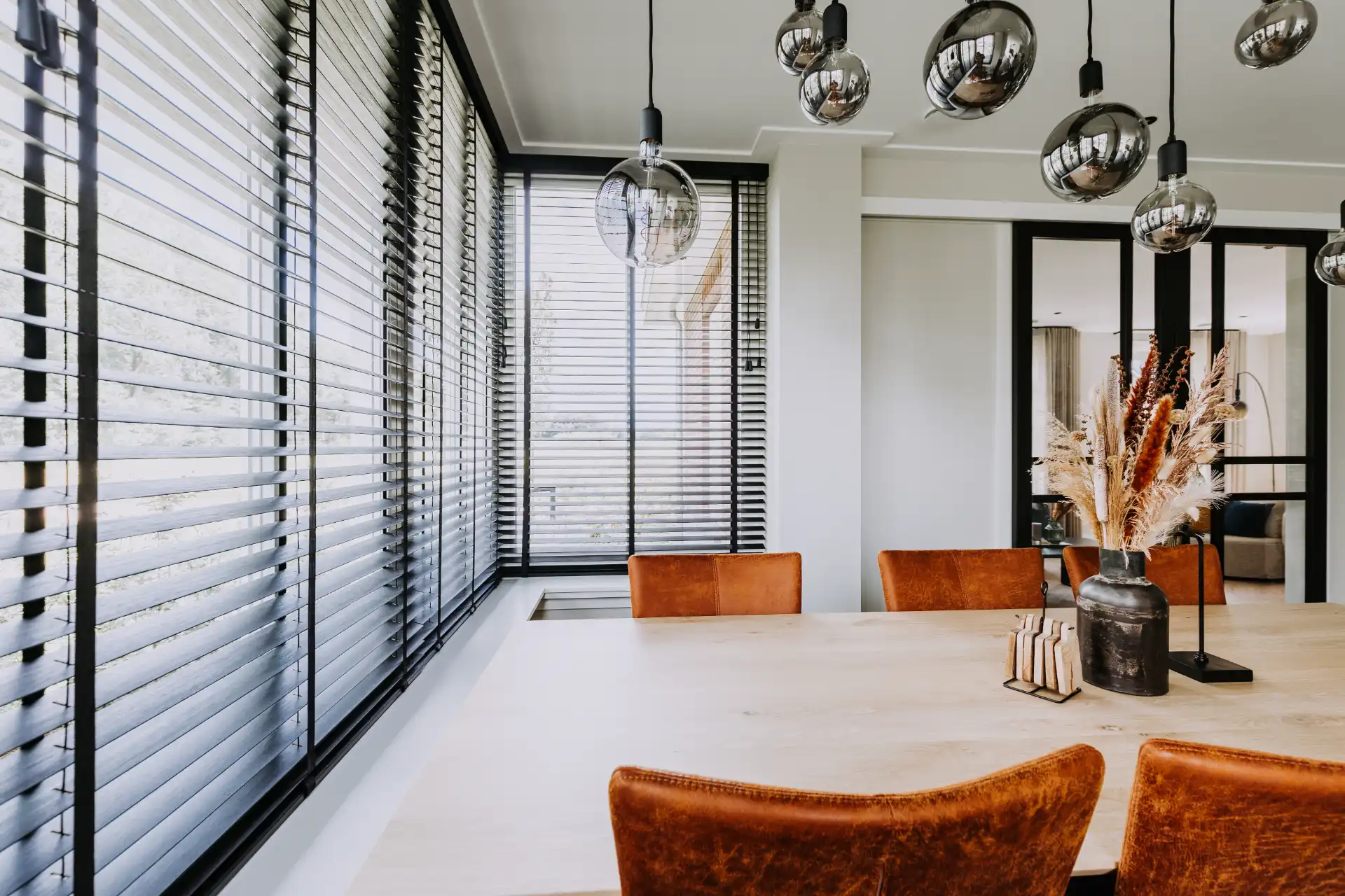 De vele ramen in deze woning vormen een belangrijk onderdeel van het interieur. Ze zorgen voor enorm veel daglicht, wat de kleurkeuzes versterkt. Door te werken met lichte gordijnen, warme accenten en een open indeling, blijft het geheel luchtig en overzichtelijk.