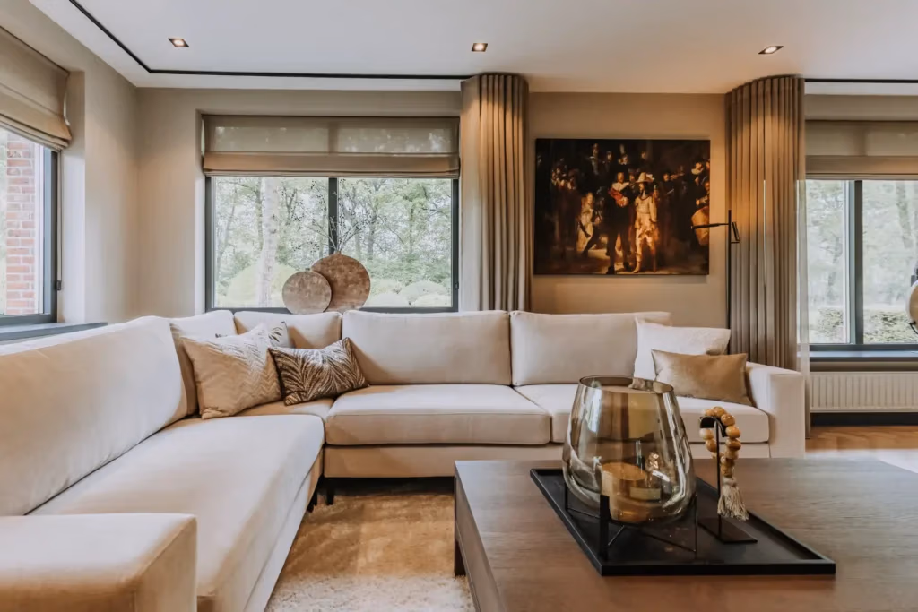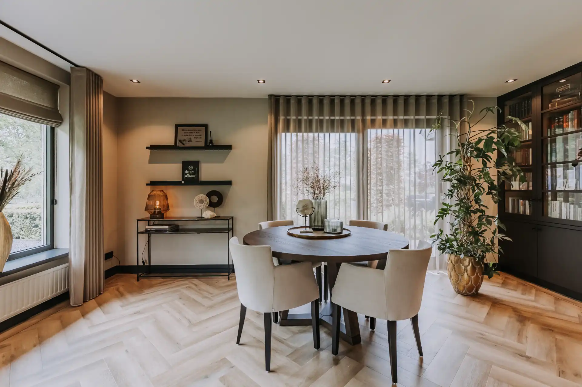 De banken, fauteuils, vloerkleden, accessoires en verlichting zijn in dit interieur zorgvuldig gekozen en op elkaar afgestemd. De raambekleding speelt daarin een belangrijke rol. Inbetweens met waveplooi op een stijlvolle designrail en vouwgordijnen in zachte stoffen zorgen voor een rustige lichtinval én een elegante uitstraling. Door het hele huis loopt een lijn van materialen en kleuren die het geheel tot een samenhangend en sfeervol thuis maken.